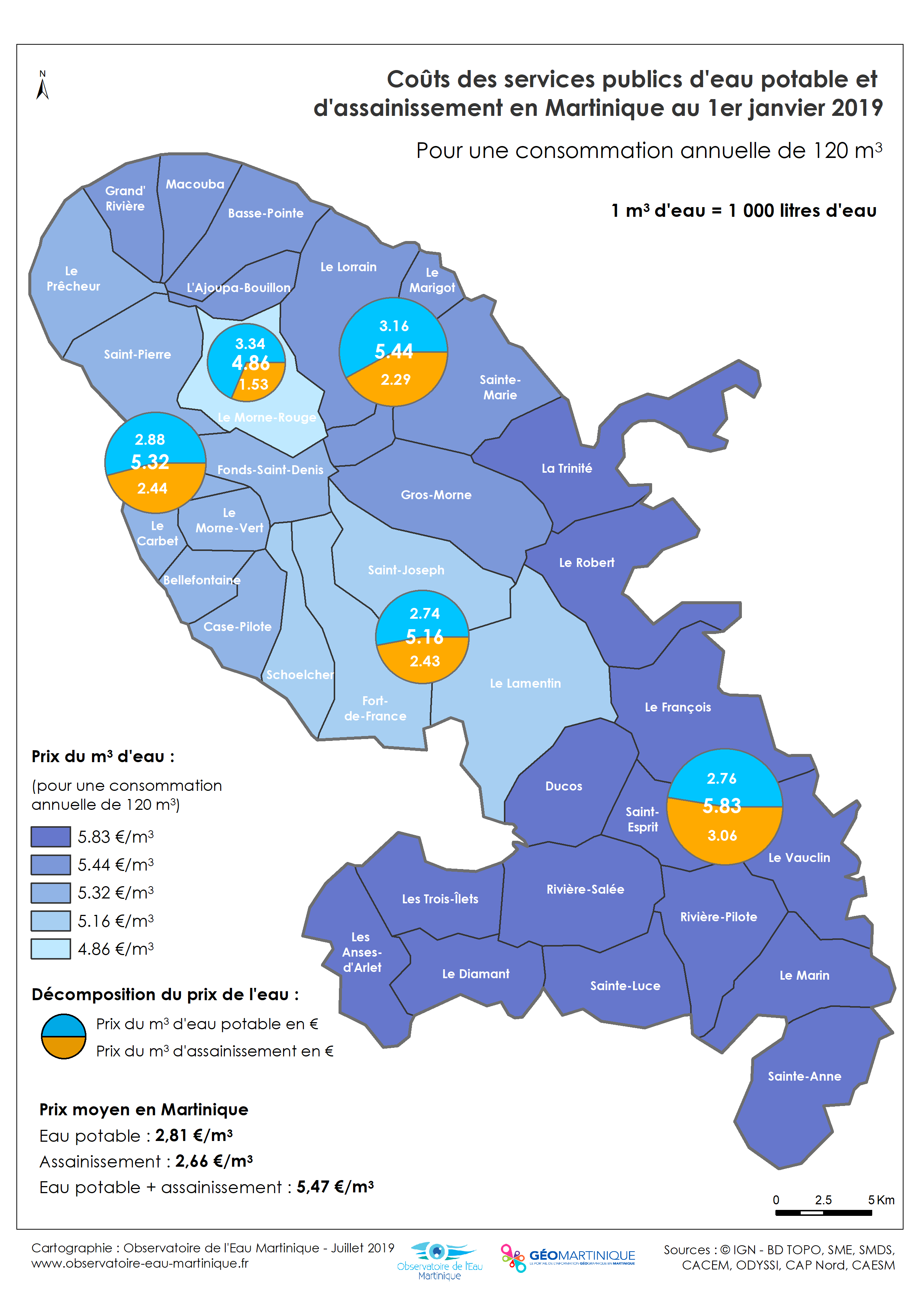 Prix du m3 d’eau potable et d’assainissement en Martinique au 1er janvier 2019.