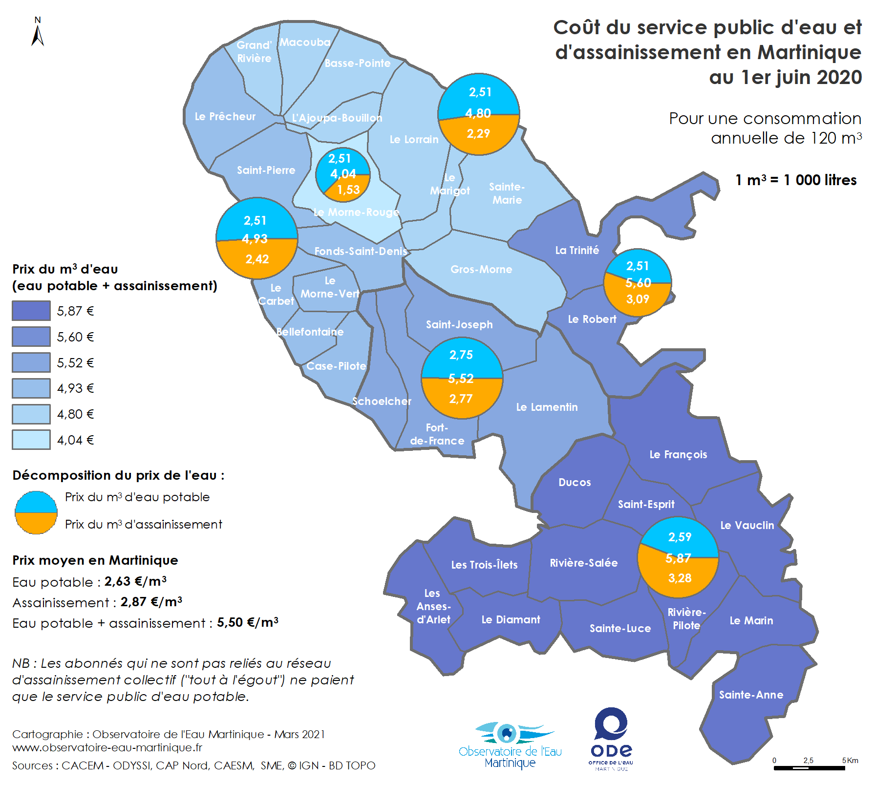Prix du m3 d’eau potable et d’assainissement en Martinique au 1er juin 2020.