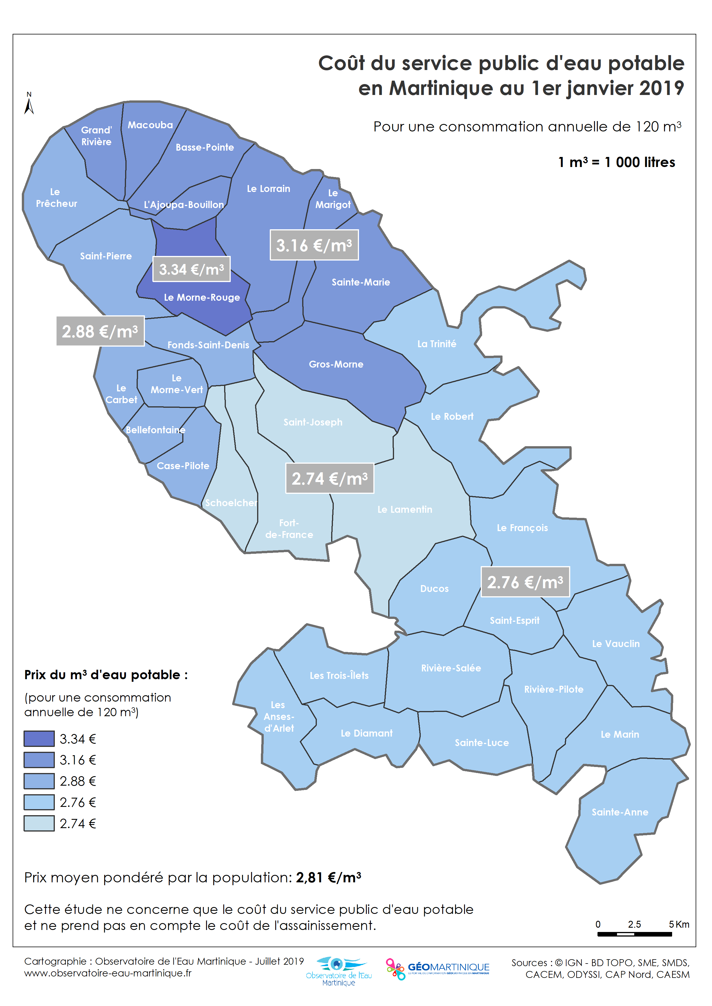 Coût du service public d'eau potable en Martinique au 1er janvier 2019