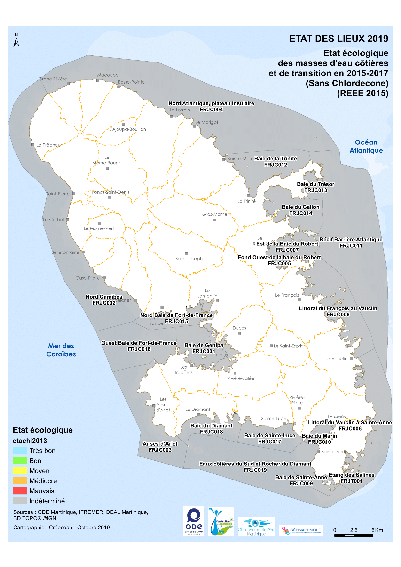 EDL 2019 – État écologique des masses d'eau côtières et de transition sans chlordécone (2015 – 2017)