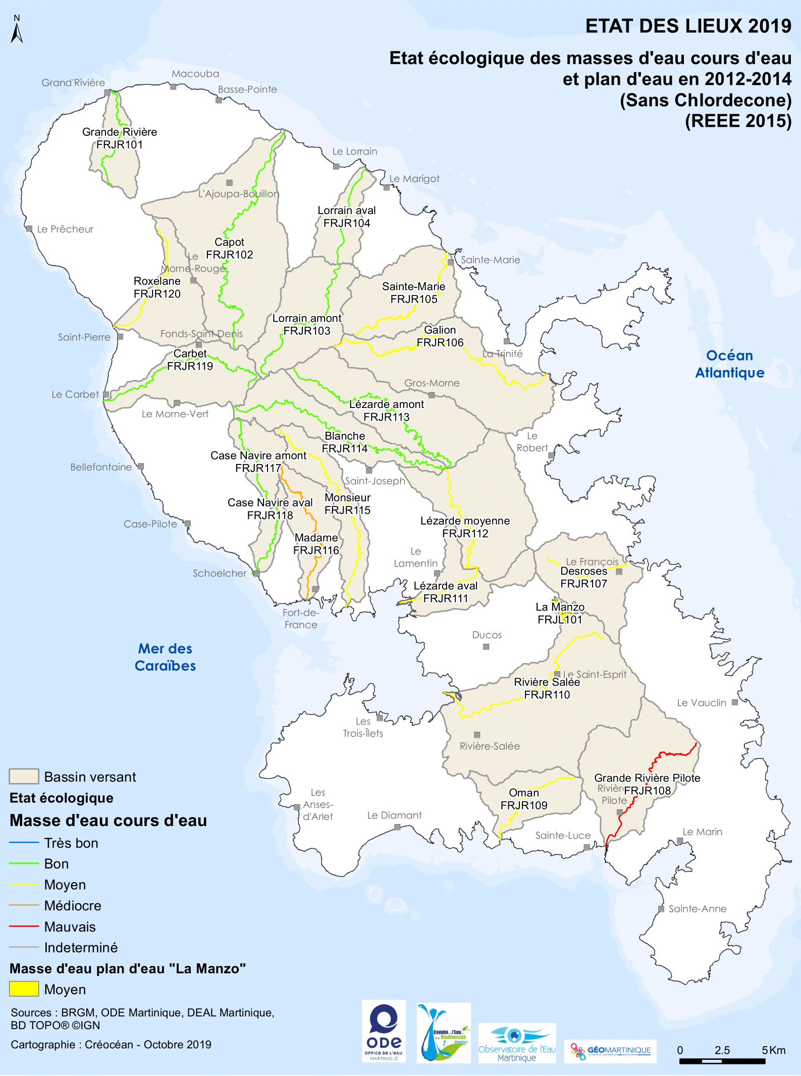 EDL 2019 – Etat écologique des masses d'eau cours d'eau et plan d'eau sans chlordécone (2012 – 2014)
