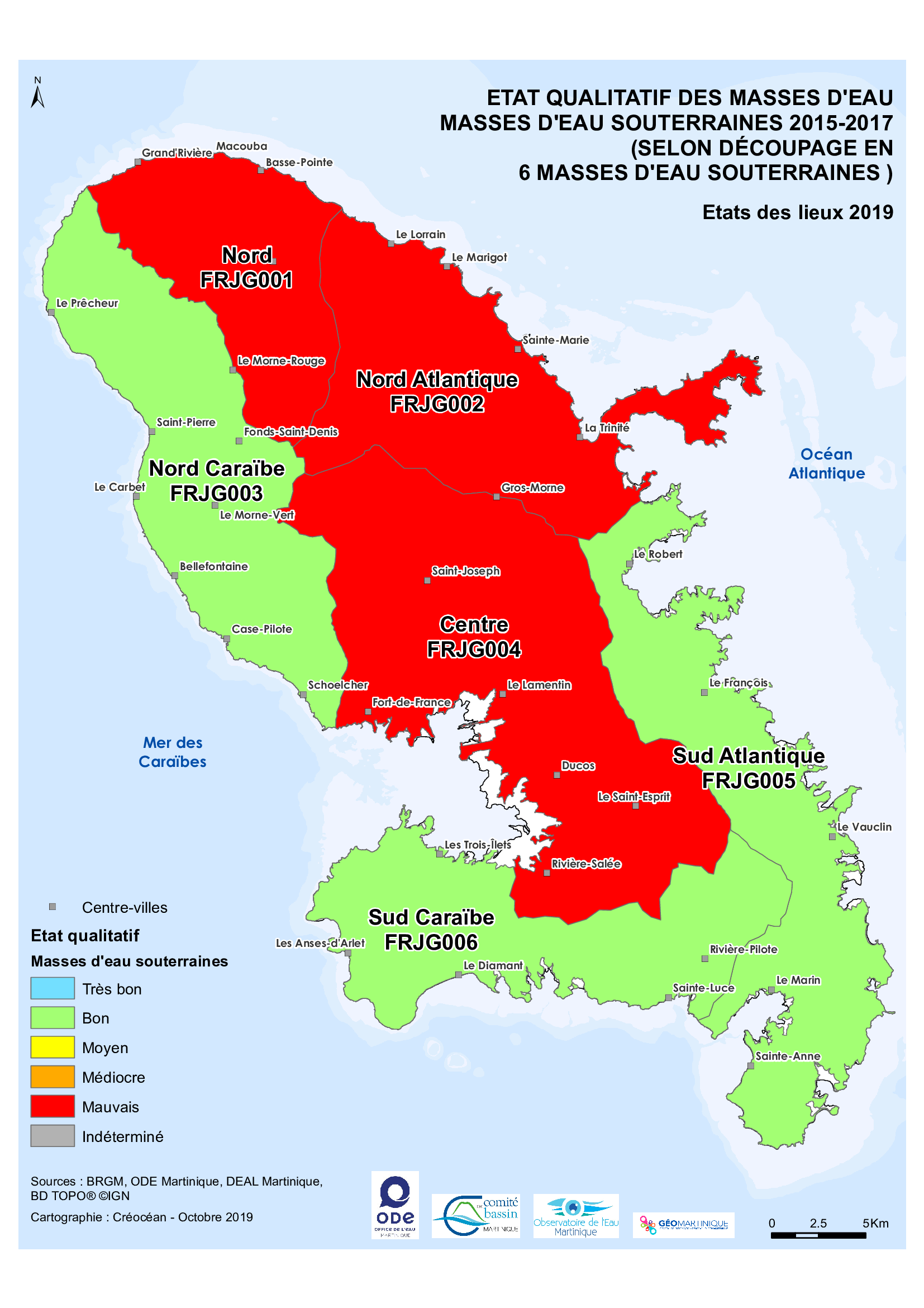 État des lieux 2019 – État qualitatif des masses d'eau souterraines – Données 2015-2017 (selon découpage en 6 masses d'eau souterraines)
