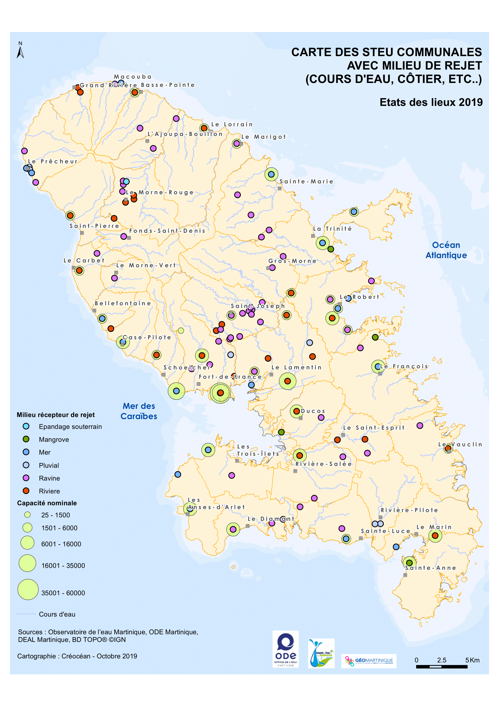 État des lieux 2019 – Localisation des stations de traitement des eaux usées (STEU) communales avec milieu de rejets (cours d'eau, côtiers…)