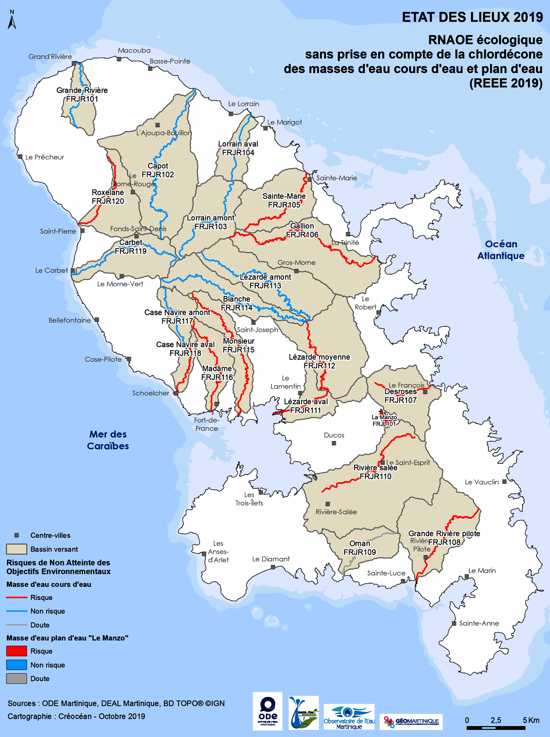 Cours d'eau, État des lieux 2019, Risque de non-atteinte des objectifs environnementaux (RNAOE), Suivi DCE de la Manzo : État des lieux 2019 – Risque de non atteinte des objectifs environnementaux (RNAOE) écologiques sans prise en compte de la chlordécone des masses d’eau cours d’eau et plan d’eau (REEE 2019)