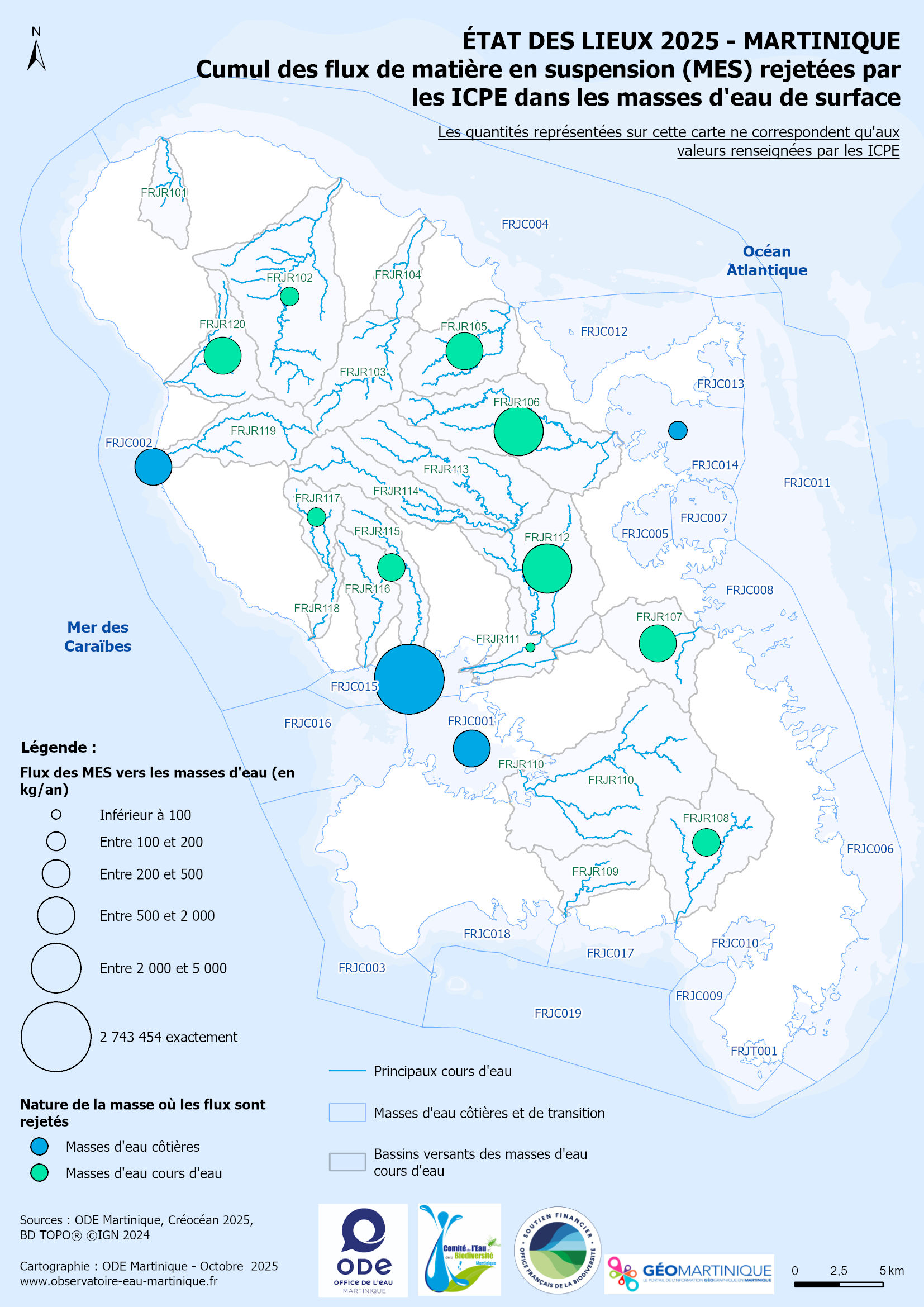 État des lieux 2025 – Cumul des flux de matière en suspension (MES) rejetées par les ICPE dans les masses d'eau de surface