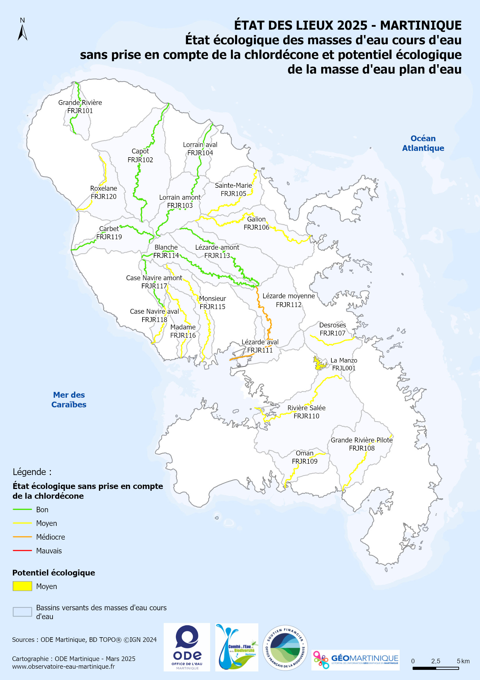 État des lieux 2025 – État écologique des masses d'eau cours d'eau sans prise en compte de la chlordécone et potentiel écologique de la masse d'eau plan d'eau