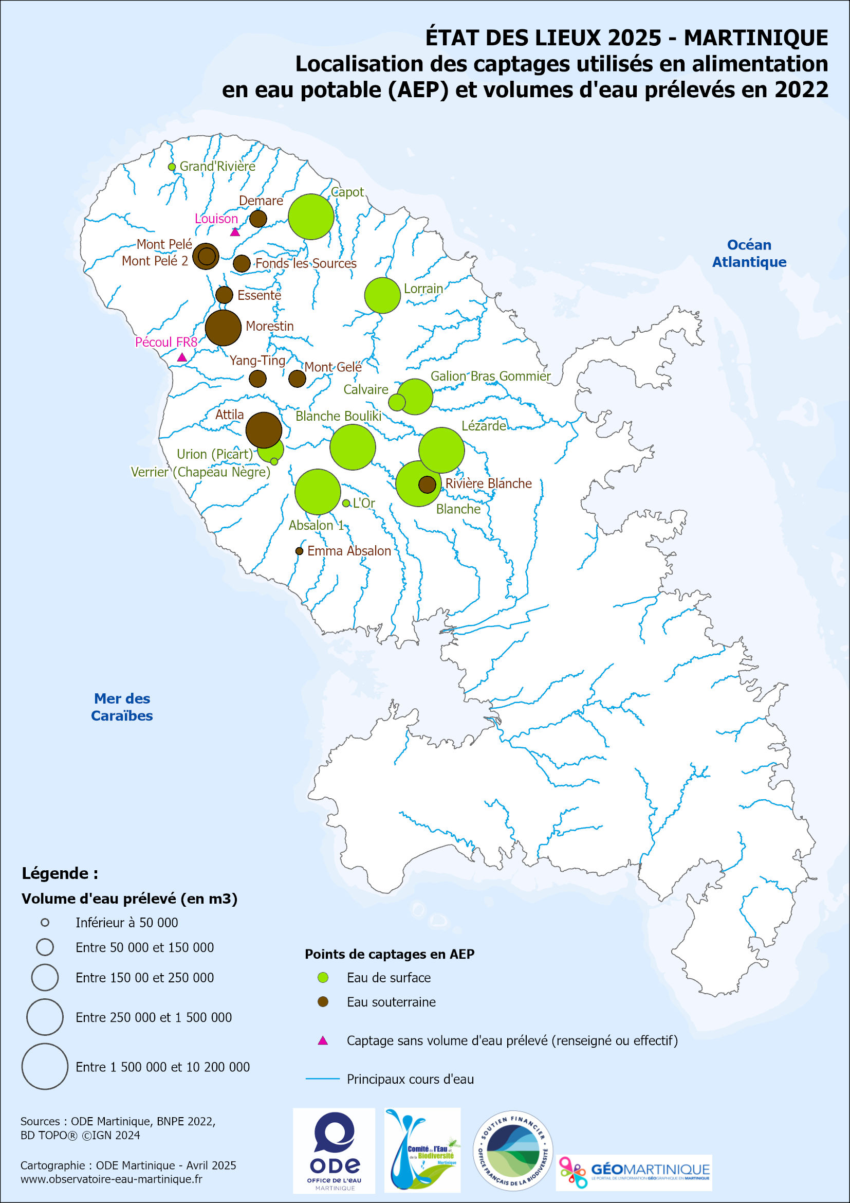 État des lieux 2025 – Localisation des captages utilisés en alimentation en eau potable (AEP) et volumes d'eau prélevés en 2022
