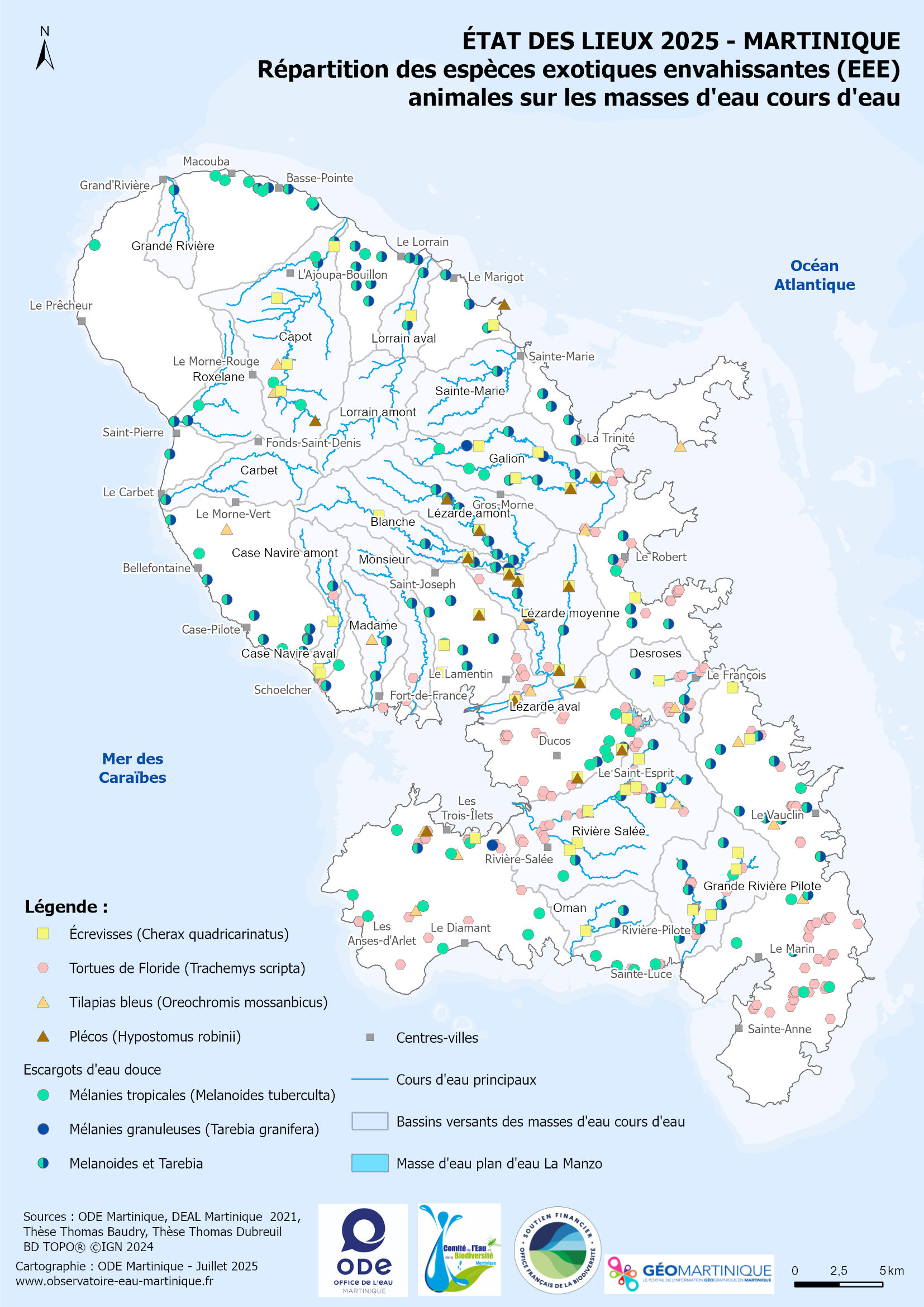 État des lieux 2025 – Répartition des espèces exotiques envahissantes (EEE) animales sur les masses d'eau cours d'eau