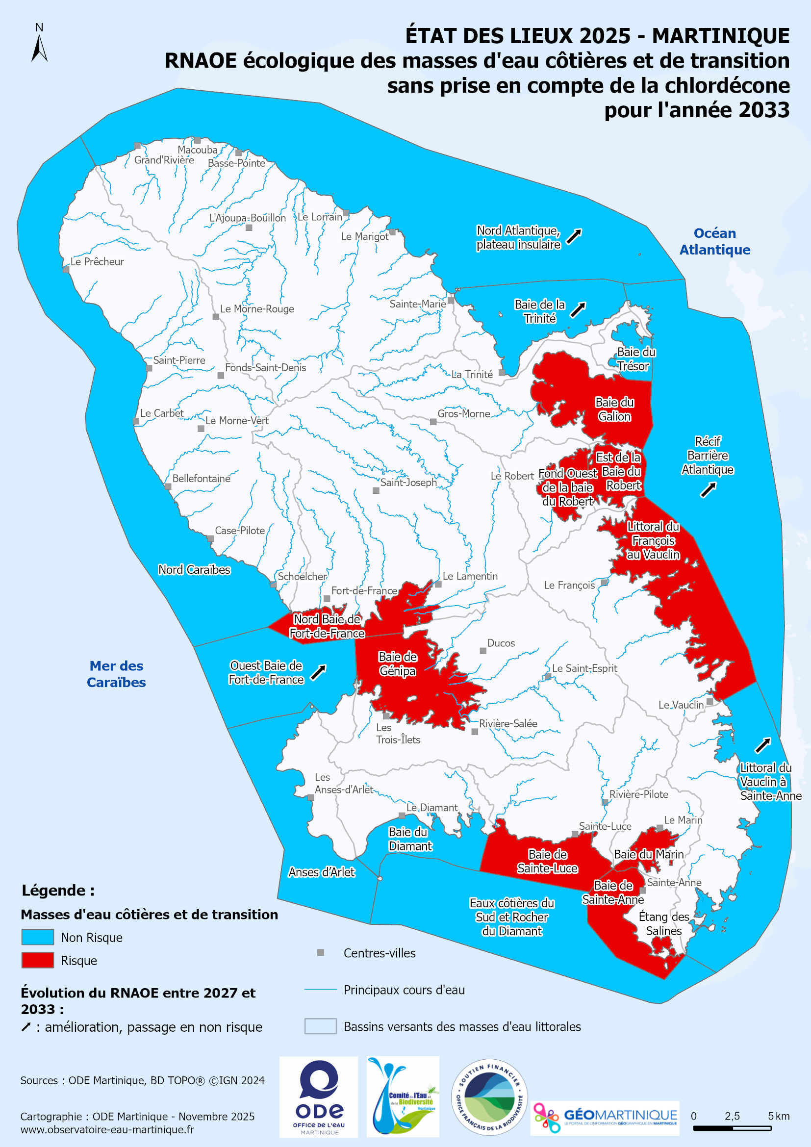 Eaux côtières, État des lieux 2025, Qualité des eaux littorales DCE, Risque de non-atteinte des objectifs environnementaux (RNAOE) : État des lieux 2025 – Risque de non-atteinte des objectifs environnementaux (RNAOE) écologique des masses d’eau côtières et de transition sans prise en compte de la chlordécone pour l’année 2033
