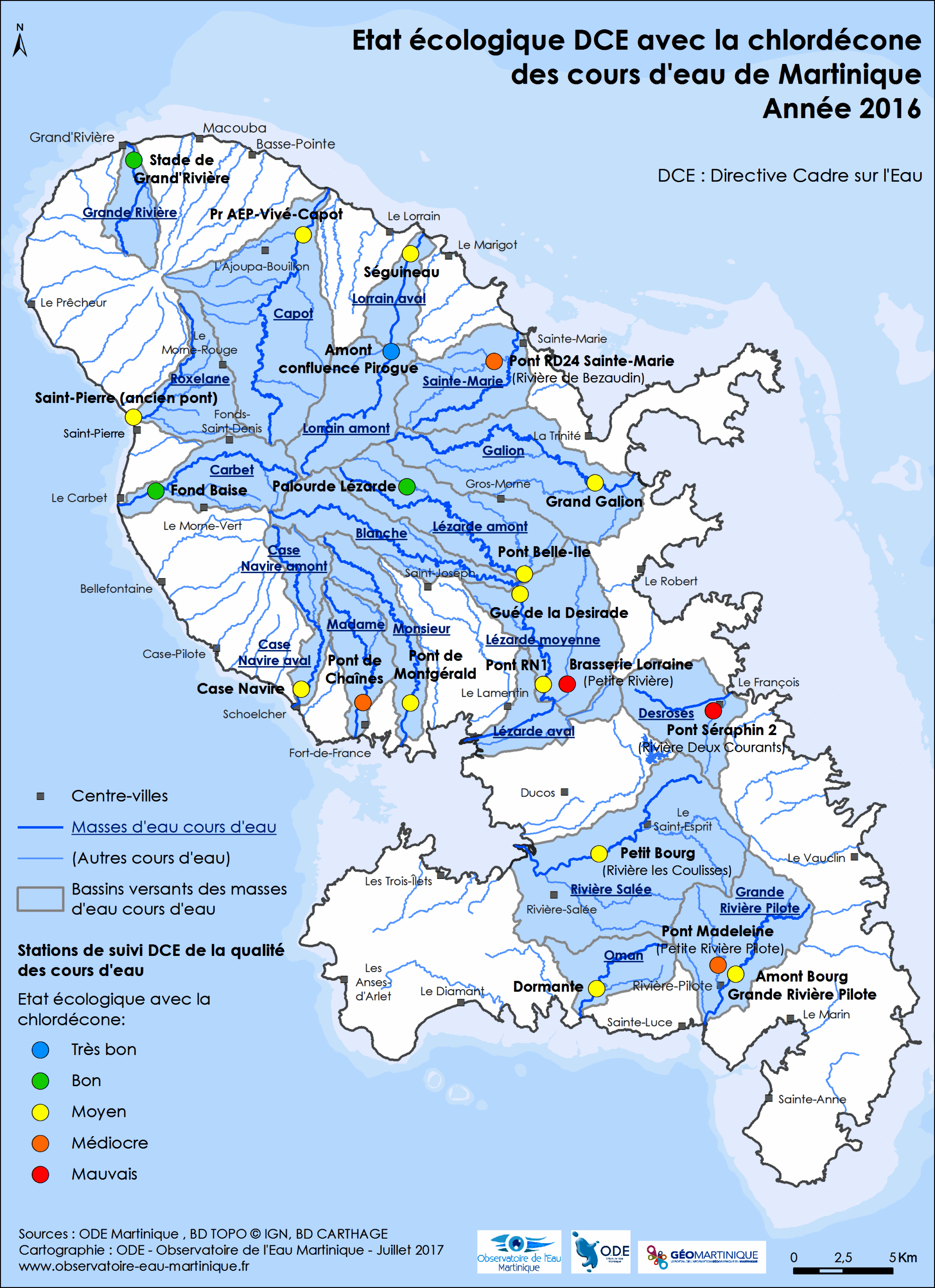 État écologique DCE avec la chlordécone des cours d'eau de Martinique en 2016
