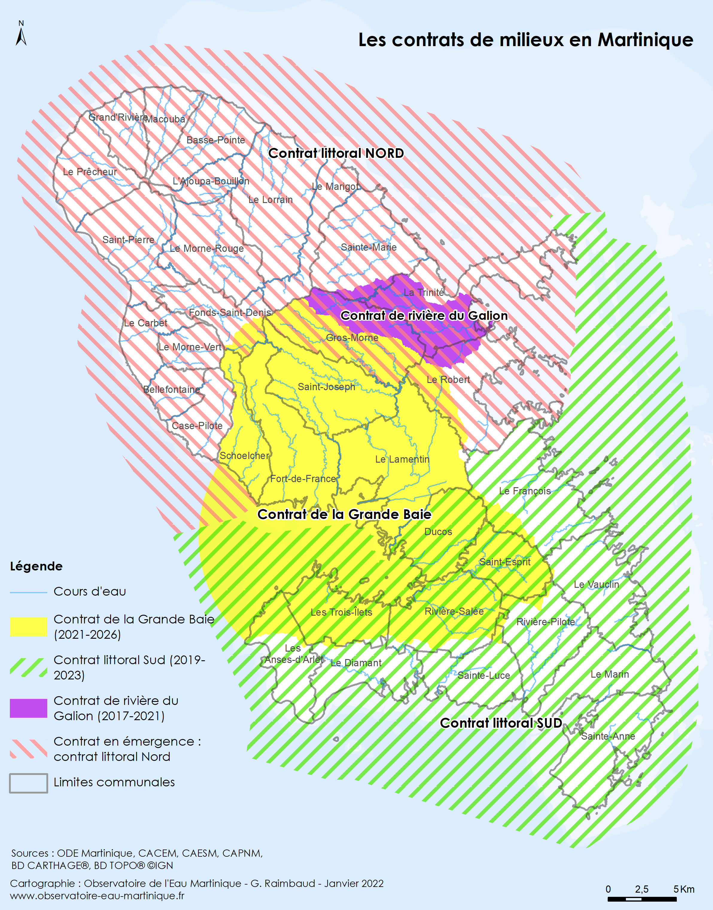 Les contrats de milieux (contrat de baie, de rivière et contrat littoral) en cours d’exécution ou d’élaboration en Martinique en 2022.