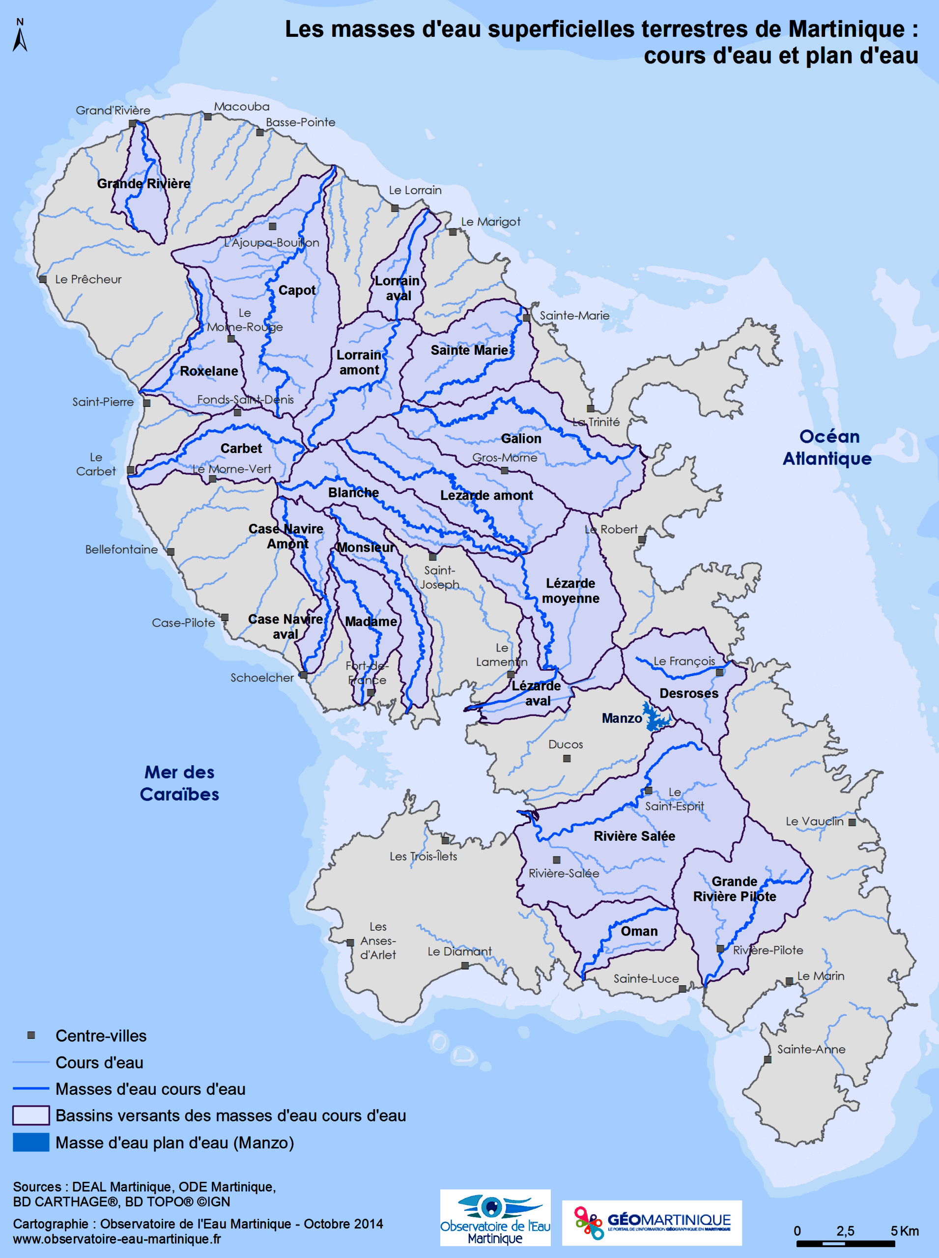Masses d'eau superficielles terrestres de Martinique : cours d'eau et plan d'eau