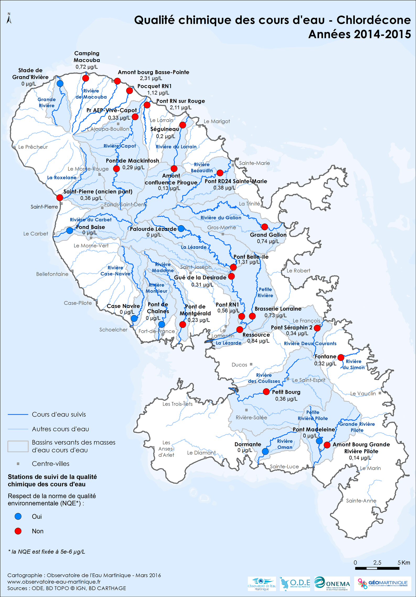 Qualité chimique des cours d'eau de Martinique – Polluant spécifique chlordécone (avec CMA) – année 2014-2015