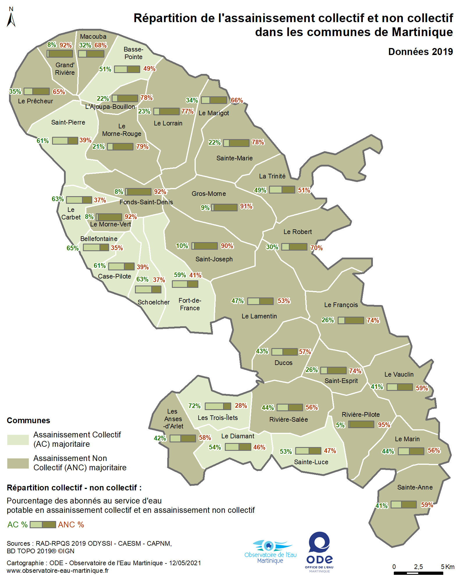 Répartition de l’assainissement collectif et non collectif dans les communes de Martinique – Données 2019