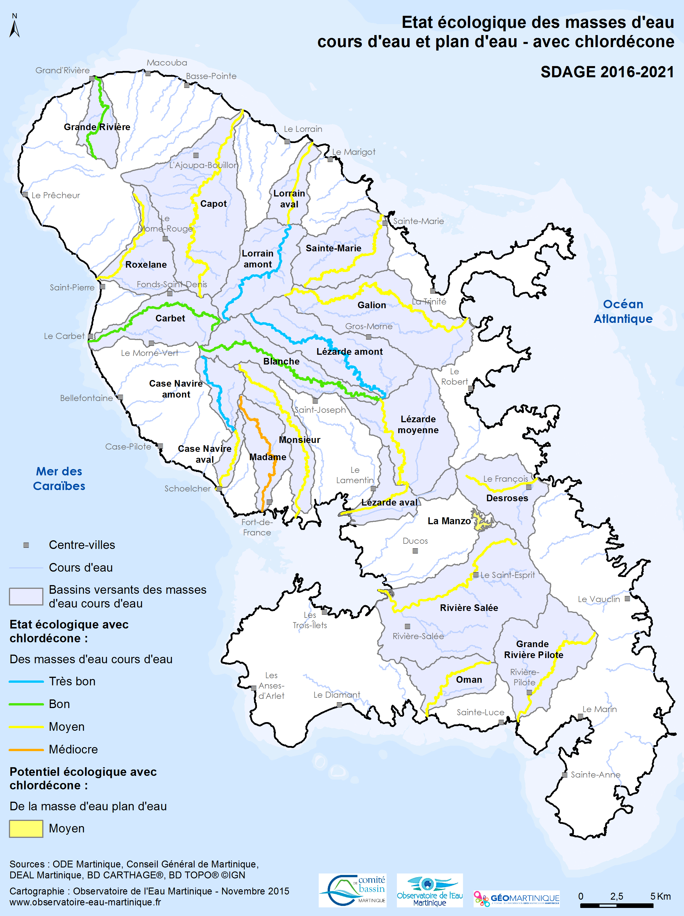 SDAGE 2016-2021 – État écologique des masses d'eau cours d'eau et plan d'eau avec chlordécone