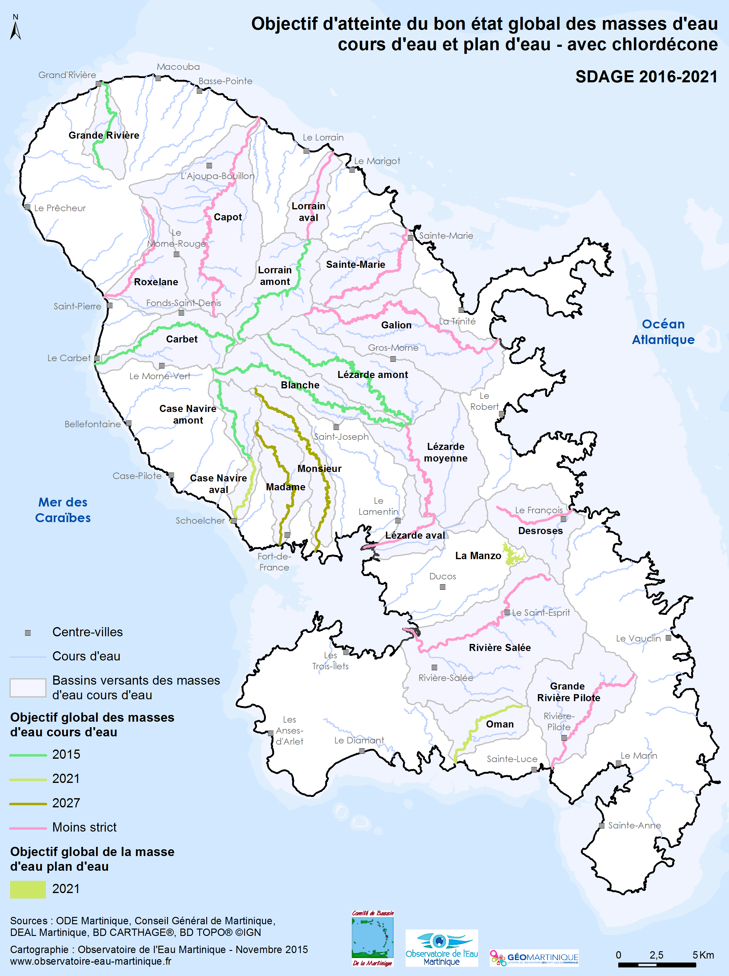 SDAGE 2016-2021 – Objectif d'atteinte du bon état global des masses d'eau cours d'eau et plan d'eau avec chlordécone
