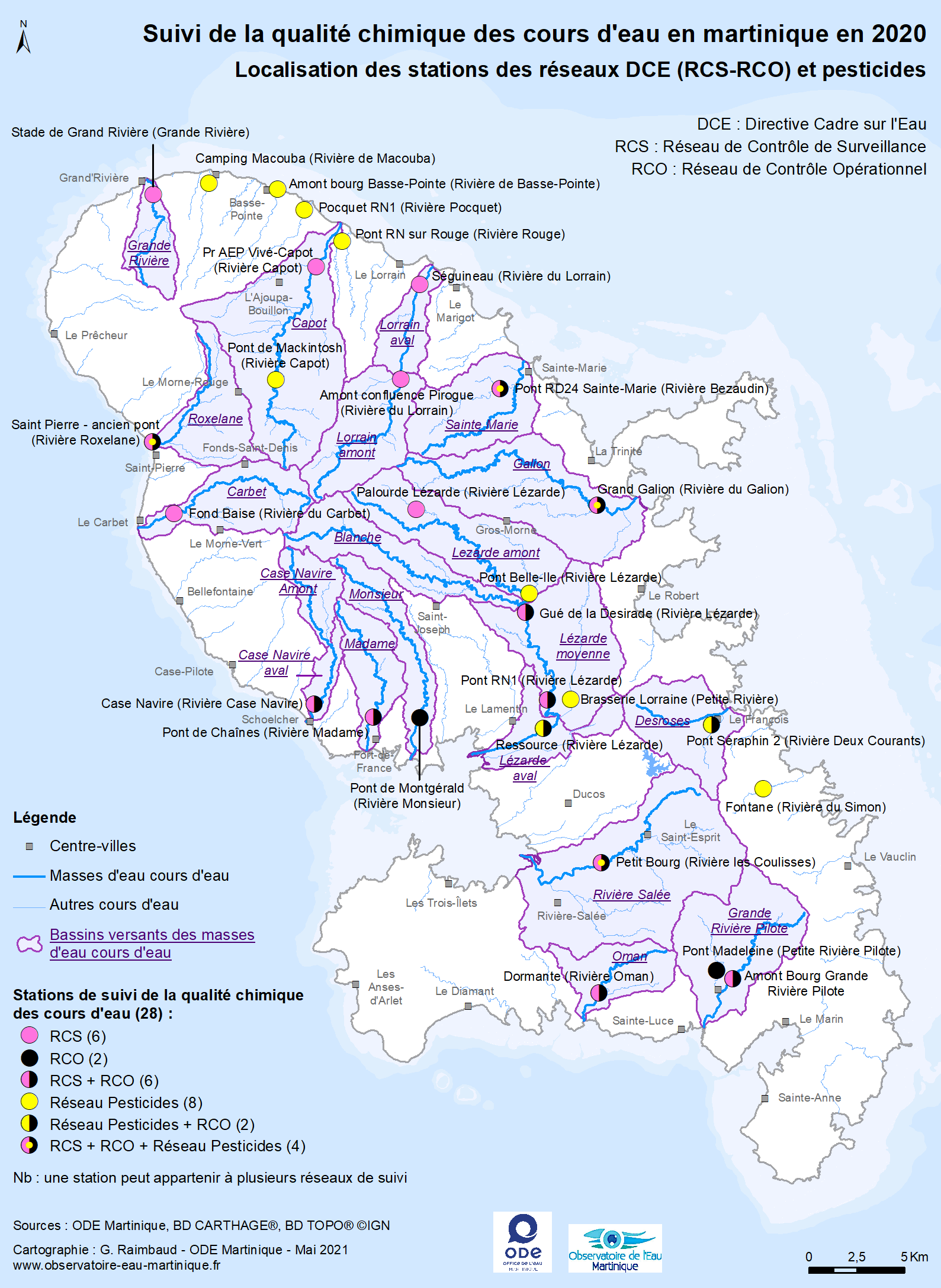 Cette carte présente la localisation des stations de suivi de la qualité chimique des cours d’eau en Martinique en 2020.