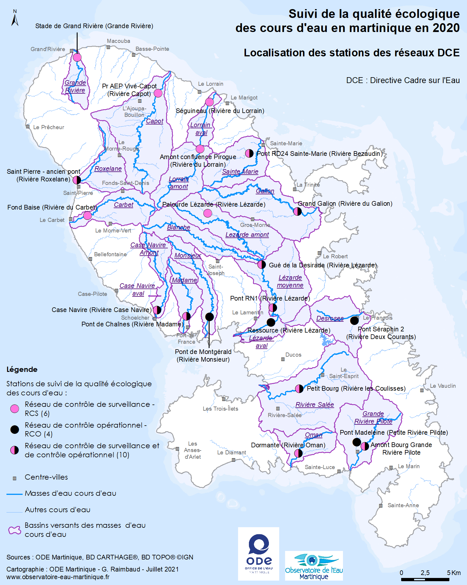 Cette carte présente la localisation des stations de suivi de la qualité écologique des cours d’eau en Martinique en 2020. Il s’agit du suivi réglementaire imposé par la DCE – Directive Cadre européenne sur l’Eau
