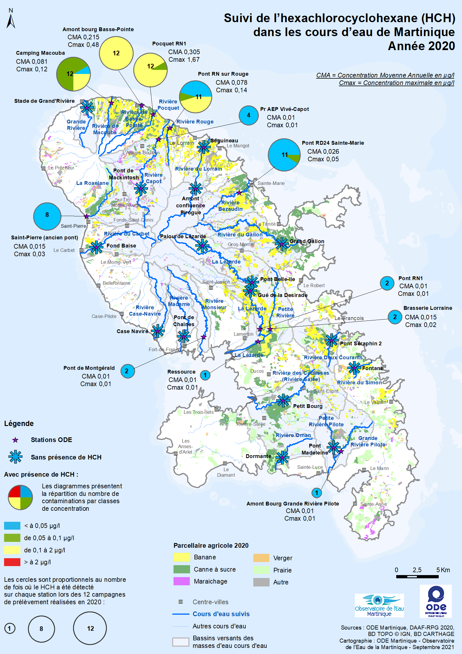 Cette carte présente les résultats du suivi de l’hexachlorocyclohexane (HCH) dans les cours d’eau de Martinique réalisé par l’ODE Martinique en 2020. 1 campagne de prélèvements d’eau a été réalisée tous les mois (soit 12 campagnes en 2020), sur 28 stations.