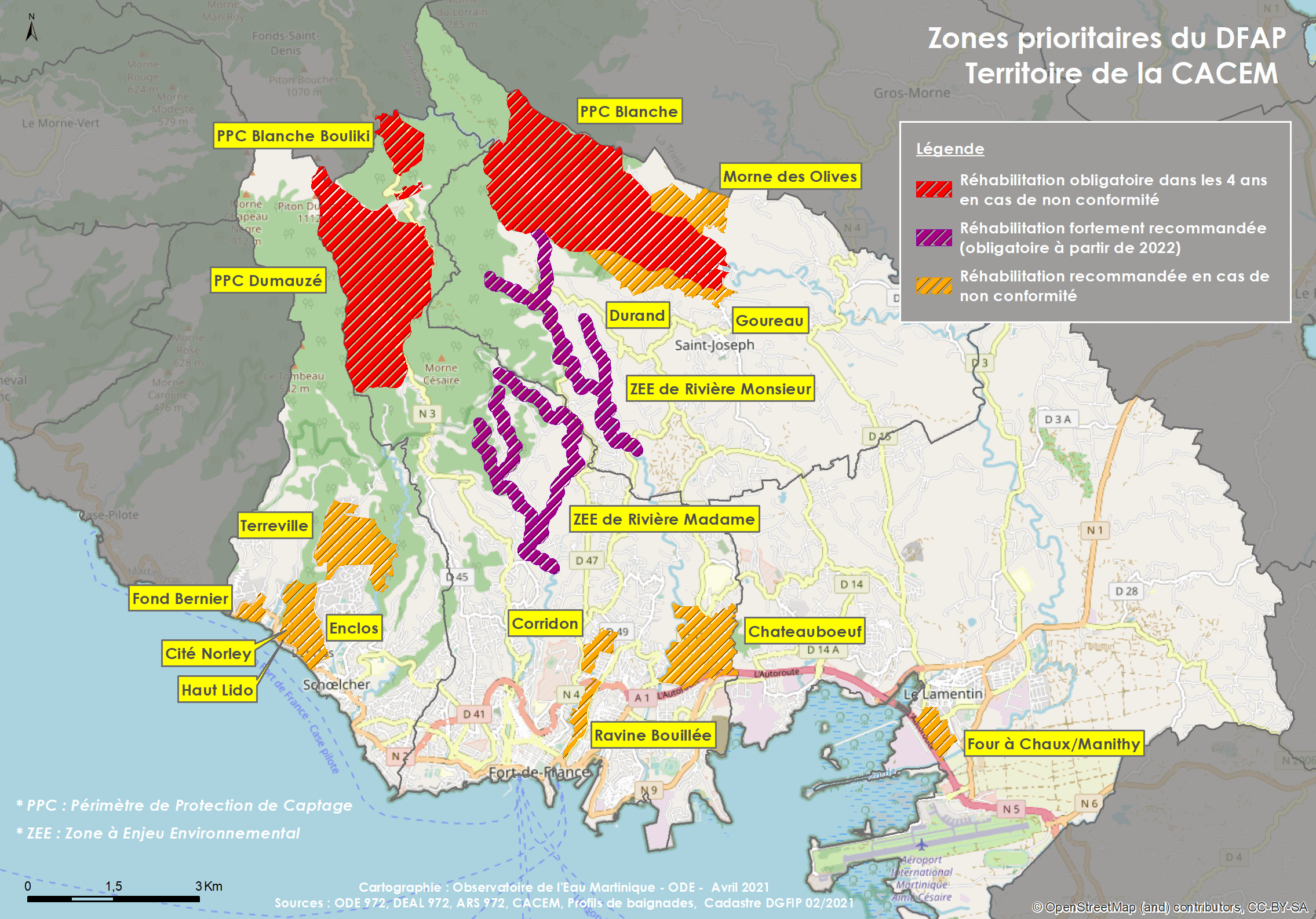 Zones prioritaires du DFAP (Dispositif de Financement de l’Assainissement pour les Particuliers) sur le territoire de la CACEM (Communauté d’Agglomération du Centre de la Martinique).