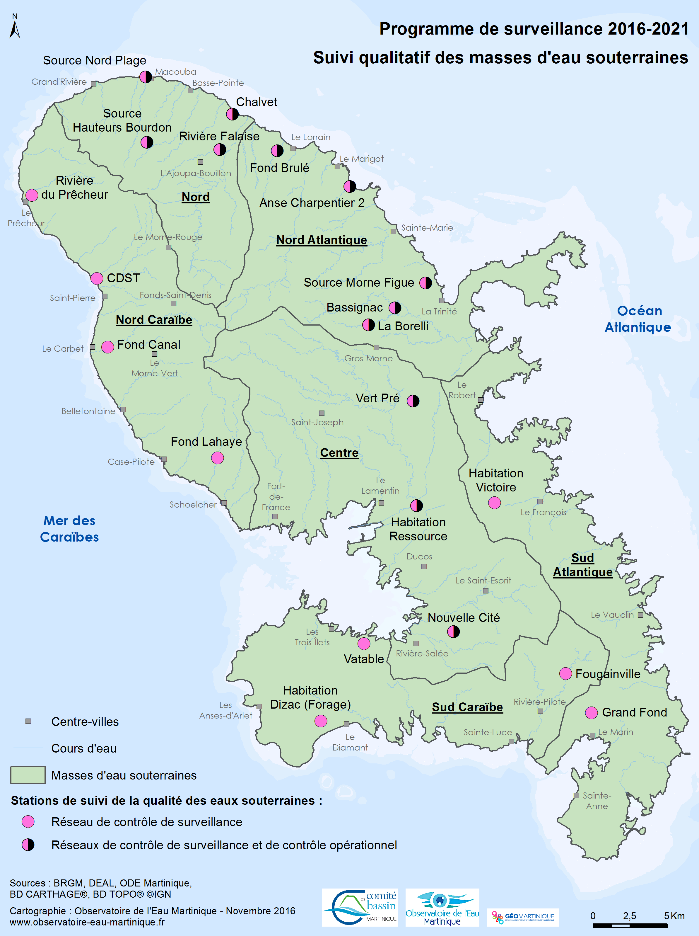 Le suivi qualitatif des eaux souterraines est réalisé par le BRGM Martinique depuis 2004, grâce à un réseau de suivi constitué de 21 ouvrages (18 forages ou piézomètres et 3 sources). Ces derniers ont été répartis de façon à couvrir les 6 masses d’eau souterraines ainsi que les principales formations géologiques rencontrées en Martinique.