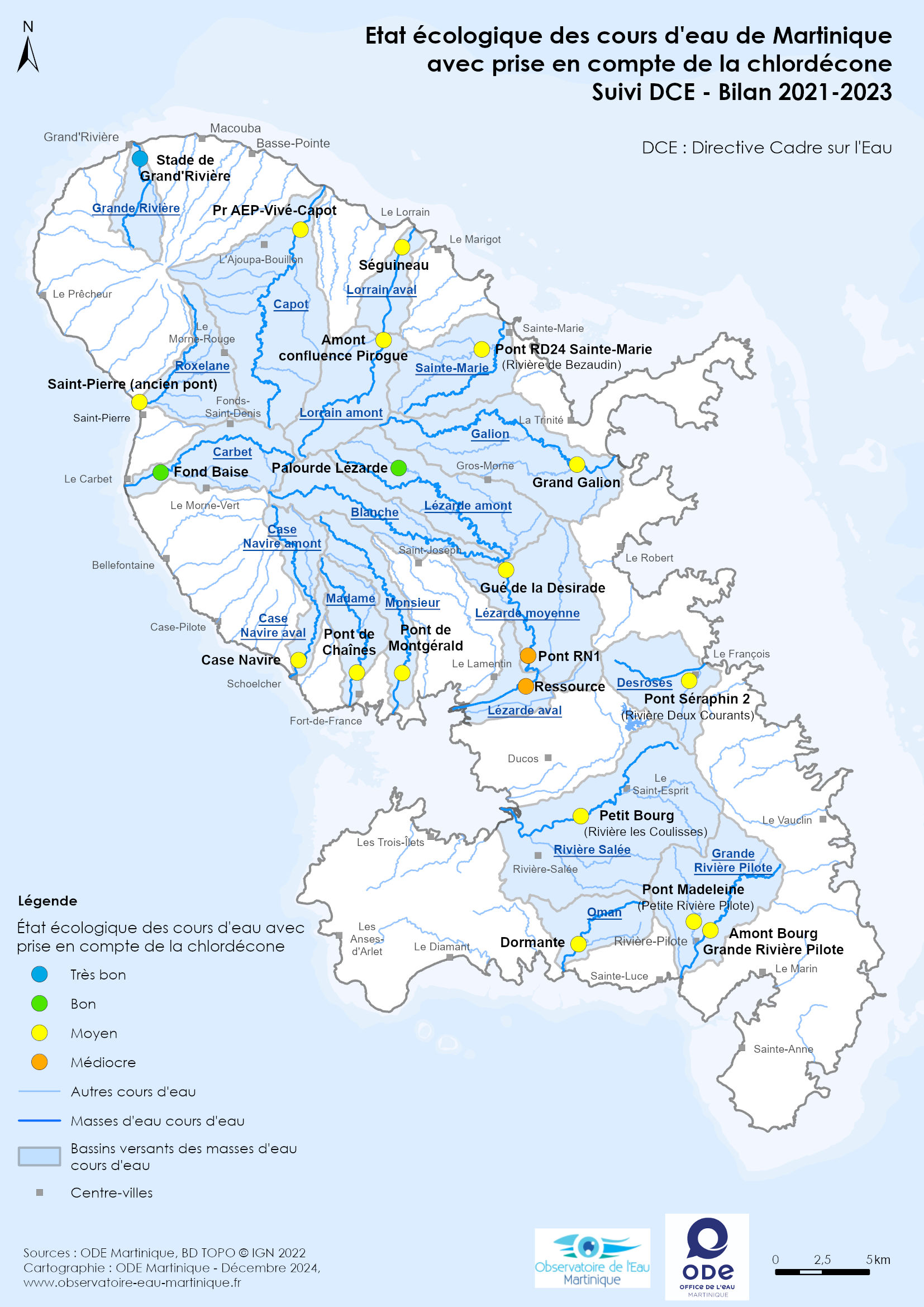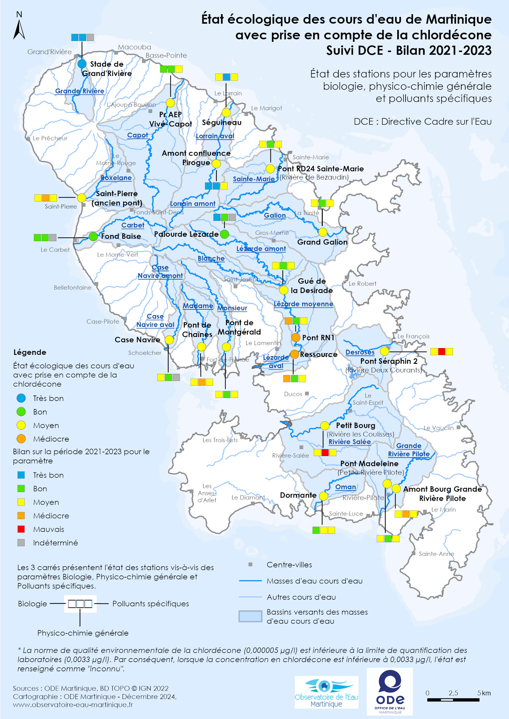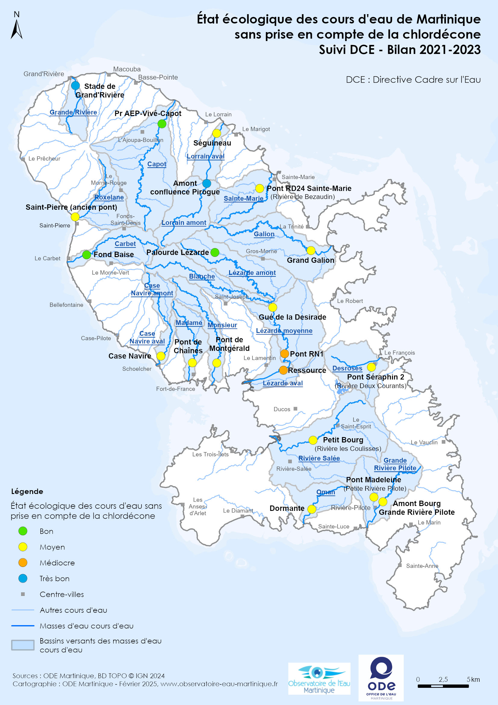 Pour l’année 2023, l’état des cours d’eau est calculé en prenant en compte les suivis réalisés sur une période de 3 ans, soit de 2021 à 2023. Pour la période concernée, l’état écologique des cours d’eau de Martinique sans chlordécone est bon pour 5 stations sur 20 (25 %). Avec chlordécone, 3 stations sont en bon état (15 %).