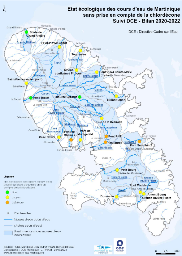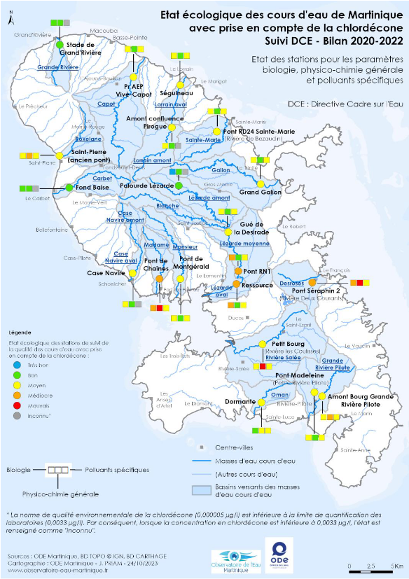 - L’état écologique sans chlordécone n’est bon que pour 5 stations soit 25 % des stations. L’état écologique avec chlordécone n’est bon que pour 3 stations soit 15% des stations. La chlordécone déclasse les stations AEP Vivé Capot et Amont Confluence Pirogue en état moyen.