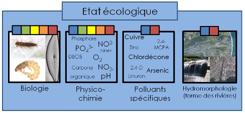 L’état écologique repose sur l’évaluation d’éléments de qualité biologique (diatomées et macro-invertébrés), physico-chimique, hydromorphologique et sur le respect des normes de qualité environnementale des concentrations maximales admissibles de 9 polluants spécifiques synthétiques.
