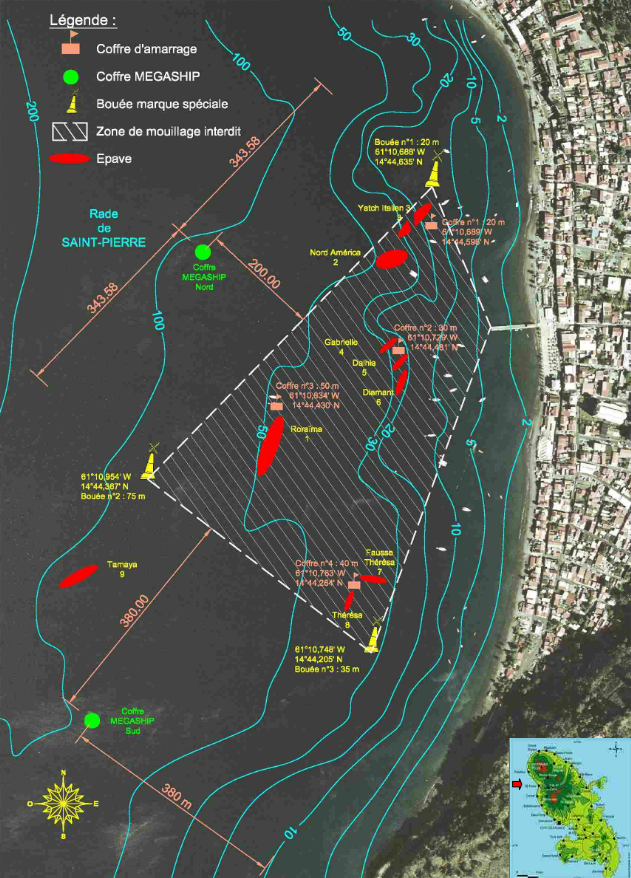 C’est la plus importante concentration de mouillage tendu en grande profondeur (-75 m) en fonction. Le balisage protège les épaves historiques (Roraïma, Gabrielle, Diamant, Dalhia, Theresa,…) coulées le 8 mai 1902 lors de l’éruption volcanique de la Montagne Pelée. À noter que l’épave du Tamaya, non intégrée dans la zone de mouillage interdit, est de fait protégée de par la grande profondeur (environ 85 m) où elle se trouve, car aucun navire ne mouille à de telles profondeurs. De plus, les plongées à l’air étant limitées à 60 m, la présence d’une bouée à cet endroit aurait pu inciter un plongeur à tenter une incursion ‘main sur main’ le long d’un mouillage ‘sécuritaire’.