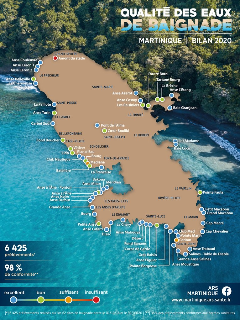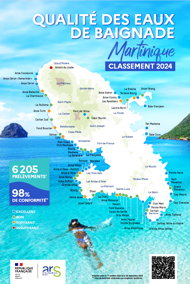 Il est à noter qu’entre 2023 et 2024, 9 sites de baignade en “excellente qualité” ont basculé en “bonne qualité” tandis que les 3 sites de Anse Turin, Anse Mabouya et Bourg de Tartane ont vu leur qualité basculer de “bonne” vers “suffisante”.