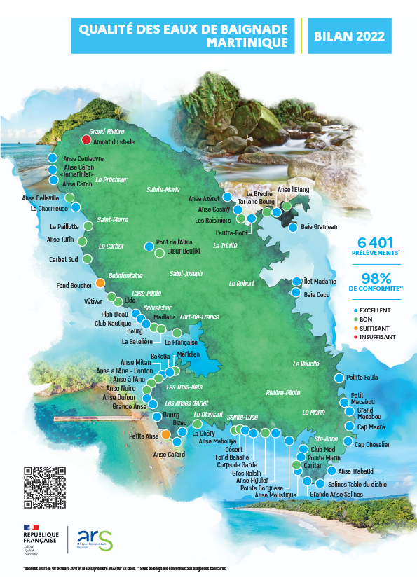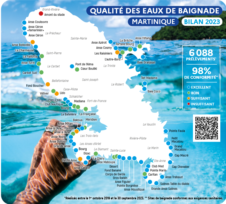 Il est à noter qu’entre 2022 et 2023, 4 sites de baignade en mer ont vu leur qualité de l’eau se dégrader et passer de “bon” à “suffisant”. Il s’agit des sites de l’Anse Belleville, des Raisiniers, du Lido et de l’Anse à l’Âne – Ponton. À l’inverse, la qualité de l’eau du site de Gros Raisin s’est améliorée et est passée de “bonne” à “excellente”.