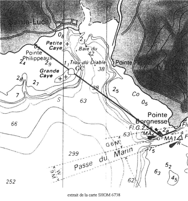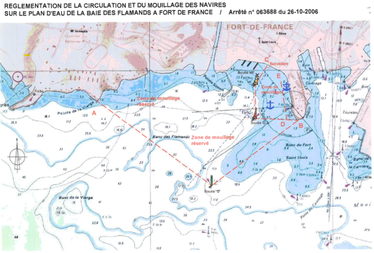 De plus, le mouillage est interdit dans la bande située le long du Fort Saint-Louis, entre le littoral et les points D et E sur la carte ci-dessous.