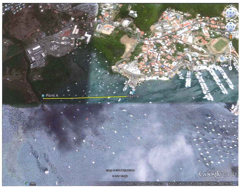 Parmi d’autres activités, le mouillage des navires et engins flottants est interdit dans les eaux situées au ‘nord’ de la ligne reliant l’embouchure de la ravine Trou Manuel (point A) jusqu’à l’extrémité de l’appontement est du port de pêche (point B).