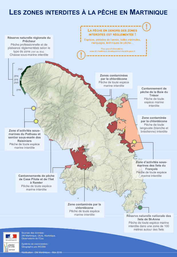 La cartographie de la Direction de la Mer ci-dessous récapitule les zones interdites à la pêche en Martinique : Retrouvez plus de précisions sur les différentes zones ci-dessous. Retrouvez également la cartographie dynamique des zones interdites de pêche en bas de la page.