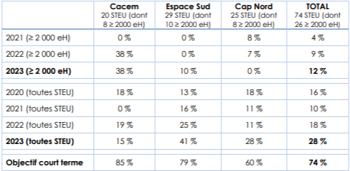 Pour 2023, le taux de conformité globale est faible : 28 %/ Il diminue jusqu’à 12 % lorsque l’on isole les plus grosses stations. Ce sont pourtant celles qui traitent les charges de pollutions les plus élevées et qui doivent donc faire l’objet d’une attention renforcée. Retrouvez la répartition des stations en conformité par EPCI dans le tableau ci-dessous.