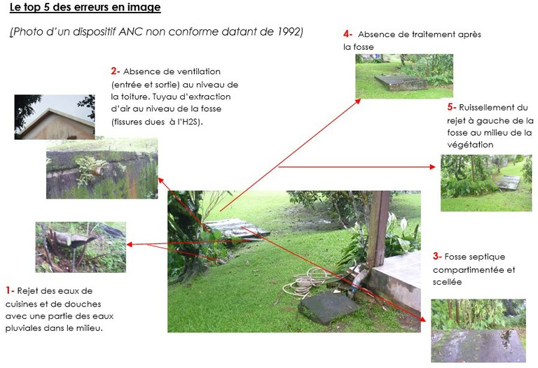 Ainsi, les « dispositifs » les plus répandus en Martinique sont en général constitués d’une simple fosse septique compartimentée sans traitement (qui n’a jamais été qu’un prétraitement), sans aération (ce qui peut expliquer les mauvaises odeurs à proximité de l’habitat) avec un rejet direct des eaux ménagères (eaux de cuisine et bain) dans le milieu naturel.