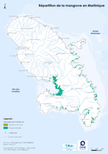 La mangrove en Martinique couvre une superficie d’environ 1 700 hectares, représentant une part importante des zones humides de l’île. Sa répartition est loin d’être uniforme et elle se concentre principalement dans la Baie de Génipa, située au sud de Fort-de-France, où l’on trouve la plus vaste étendue de mangrove de l’île (environ 1 200 hectares, soit environ 65 % du total).