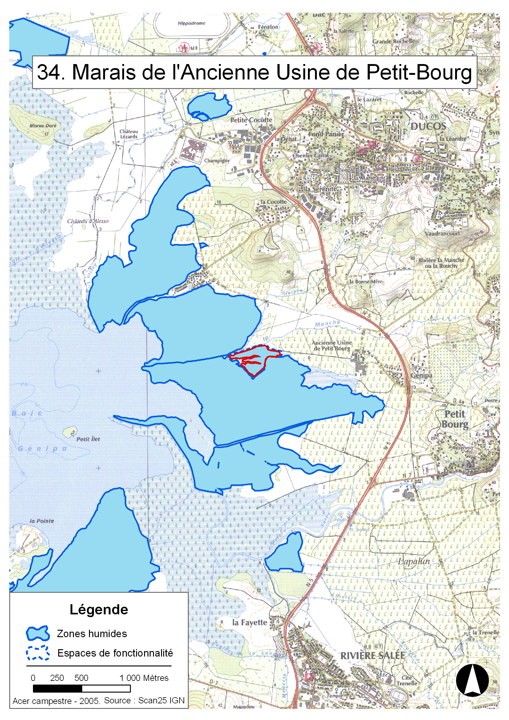 | Marais et prairies herbacés saumâtres ou salés | Marais de l’Ancienne Usine de Petit-Bourg (Ducos) | ZH34 | DG34 | I34 |
