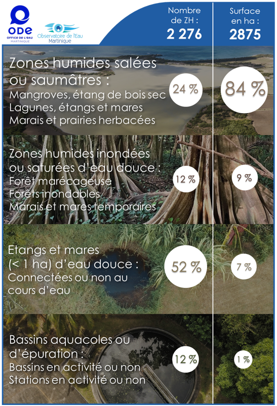 Les zones humides couvrent une superficie de 2 875 hectares, soit 2,5 % de la surface du territoire de la Martinique. Au total, ce sont 2 276 zones humides qui ont été recensées, soit en moyenne un peu plus de 2 zones humides au km2. Les mangroves, qui constituent une des spécificités de l’île, occupent plus de la moitié de la surface en zones humides.