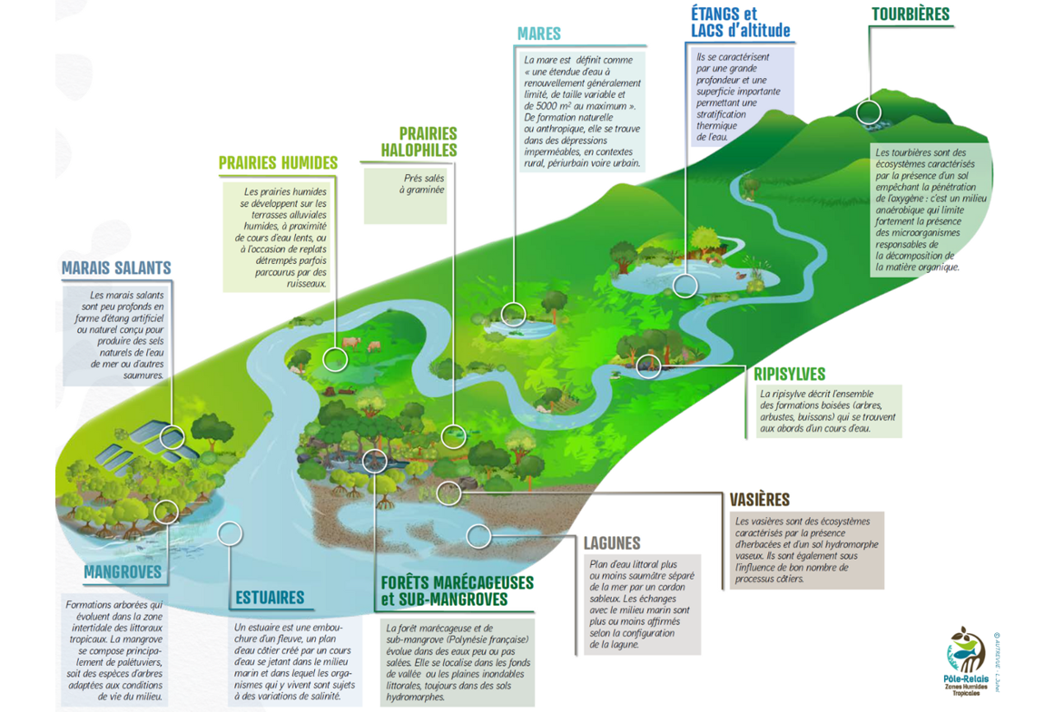 Le Pôle Relais Zones Humides Tropicales, un des 5 pôles-relais travaillant sur les milieux humides à l’échelle nationale, a identifié les types de zones humides retrouvées dans les milieux tropicaux, et donc potentiellement en Martinique.